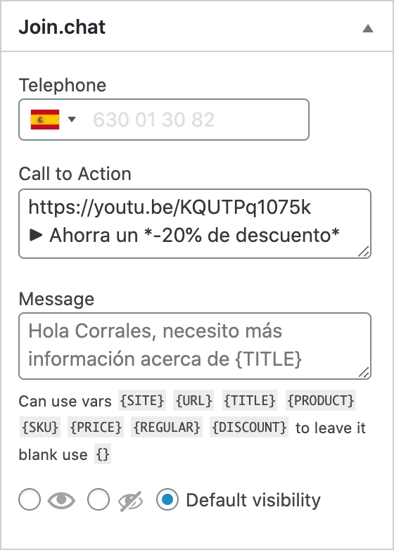Joinchat allows using dynamic variables within your messages to automatically customize content based on the page the visitor is viewing. These variables are replaced in real time with specific site or product values (if you use WooCommerce).