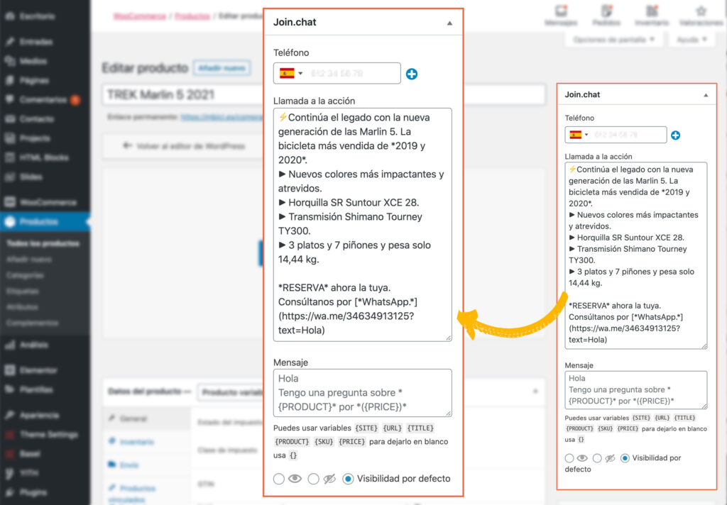 - Call to action for products. CTA window that defines text to encourage users to contact WhatsApp. You can write text with formatting styles as in WhatsApp: italic_ black ~blackened~. Even use emoji icons and ASCII code. You can use the dynamic variables that will be replaced by the values of the product page the user visits: