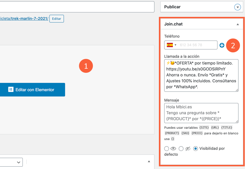 - En el lateral derecho encontrarás el Metabox de Joinchat donde podrás personalizar los Teléfonos, así como la Llamada a la acción, el Mensaje y las opciones de visualización de Joinchat para esta página en concreto.