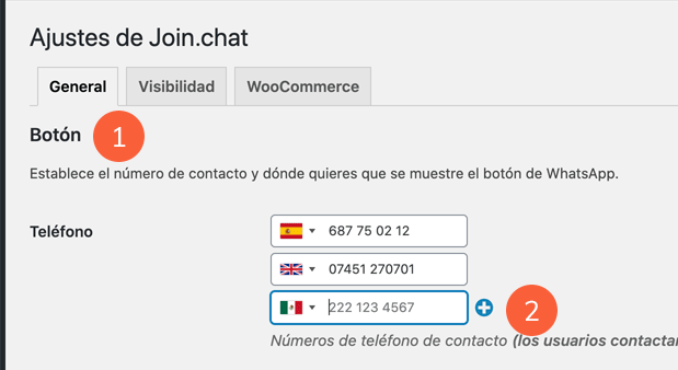 - Para agregar nuevos números de teléfono, dirígete al panel de control de WordPress y haz clic en Joinchat> Ajustes> Pestaña General.